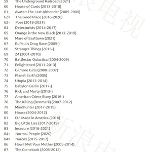 #BBC评选21世纪最佳剧集# 近日,英国BBC文化频道邀请了全球范围内的206名剧评人、文化学者和相关权威人士,投票评选21世纪最佳剧集,最终美剧《火线》(The Wire)高居第1,《广告狂人》第2,《权力的游戏》第5,《马男波杰克》第11,《迷失》第19,《黑镜》第22,《神探夏洛克》第25,《傲骨贤妻》第33,《唐顿庄园》《兄弟连》并列36,《使女的故事》38,《生活大爆炸》第56,《纸牌屋》第60,《西部世界》91。你看过几部? 据悉,这次评分采用的规则是每人选出的十佳中的第1名获得10分,第2名获得9分,以此类推。再将206张选票合计算分,得出各部剧集的总分。 BBC评选“21世纪最佳剧集”前十名: 1、《火线》(2002-2008) 2、《广告狂人》(2007-2015) 3、《绝命毒师》(2008-2013) 4、《伦敦生活》(2016-2019) 5、《权力的游戏》(2011-2019) 6、《我可以毁掉你》(2020) 7、《守望尘世》(2014-2017) 8、《美国谍梦》(2013-2018) 9、《办公室笑云》(2001-2003) 10、《继承之战》(2018-)