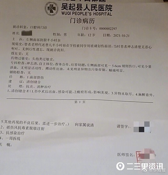 【#小学生校园内被同学用玻璃划伤面部#】近日,吴起杨女士向华商报记者反映,孩子就读于陕西吴起县第二小学,10月21日在校期间被同学用玻璃碎片划伤面部,在医院缝了7针,并担忧面部留疤后会影响孩子的容貌。 12岁男孩脸部被同学划伤 家长担心留下疤痕影响孩子容貌 10月26日,提及孩子小超(化名)最近在学校被划伤一事,杨女士和家人仍感到难以接受。杨女士称,小超今年12岁,就读于吴起县第二小学六年级,10月21日下午5点多,自己接到小超班主任的电话,说小超在学校和学生发生矛盾受了点伤让家长去医院。 “因为老二才一岁多我还要照顾小孩,当时也想着情况应该不严重,就让孩子的外公去了医院,但是去了之后我爸一看孩子脸上的伤口还比较严重。”杨女士告诉记者,当时在医院一共缝了7针,医疗费用是老师垫付的。 杨女士表示,事后自己了解到,当天下午4时30分许,小超和同班一个男孩发生了点小矛盾互相有推搡行为,后对方突然拿出一块玻璃碎片划伤小超的面部。“小孩子身上怎么会有玻璃碎片,校园的安全监管责任又在哪里?”杨女士表示,尤其是受伤的部位在脸上,自己咨询了很多医院都说要留疤,担心会影响孩子的容貌。 学校未作出回应 当地教育部门目前已介入 记者拨打吴起县第二小学高校长的电话,表明采访来意后,对方称自己不是高校长。“高校长刚出去,这个事情学校正在调解处理了,但我不知道具体情况。”该朱姓男子表示等高校长回来后回复。截止记者发稿,该校并未就此事进行回复。 划伤小超的男孩母亲表示,孩子平时一直很乖,自己也多次叮嘱在学校不要和同学发生矛盾,没想到会发生这样的事情。“现在事情既然已经发生了,我们也不是不想承担责任,也愿意积极处理此事,但是对方家长现在仅凭整形医院的咨询向我们索要20多万的赔偿,也远远超出了我们的承受范围,希望他们能拿出合理的赔偿依据。”男孩母亲说。 10月26日下午,吴起县教育科技体育局办公室工作人员表示,目前已经介入此事,正在督促调解处理。 华商报记者 贺秋平