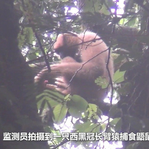 罕见!监测员拍到西黑冠长臂猿捕食鼯鼠画面
