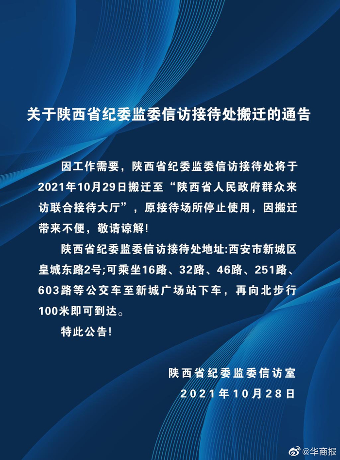 周知!#陕西省纪委监委信访接待处10月29日搬迁#】10月28日,华商报记者从陕西省纪委监委获悉,陕西省纪委监委信访接待处因工作需要将于2021年10月29日搬迁至“陕西省人民政府群众来访联合接待大厅”,原接待场所停止使用。
