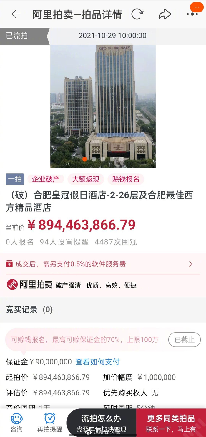 合肥皇冠假日酒店拍卖流拍:所有人负债30多亿破产 酒店仍正常运营