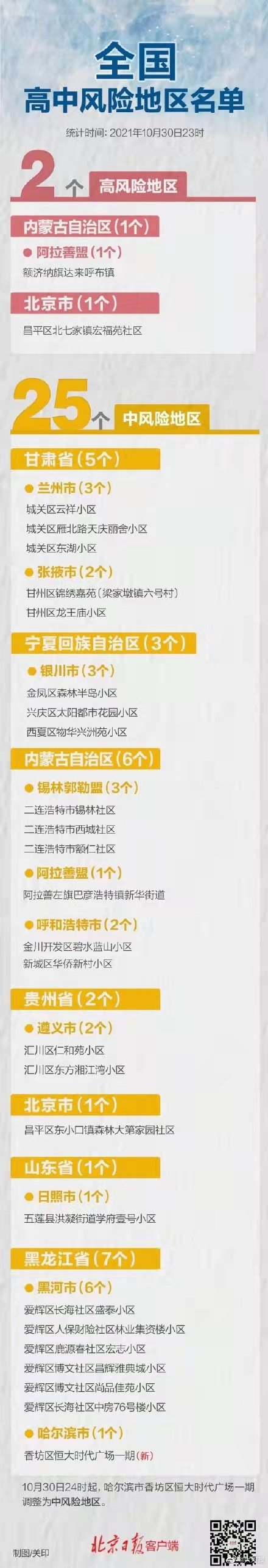 #全国目前2地高风险24地中风险#【#全国最新疫情地图# 】 #哈尔滨1地升为中风险##云南新增2例本土确诊#