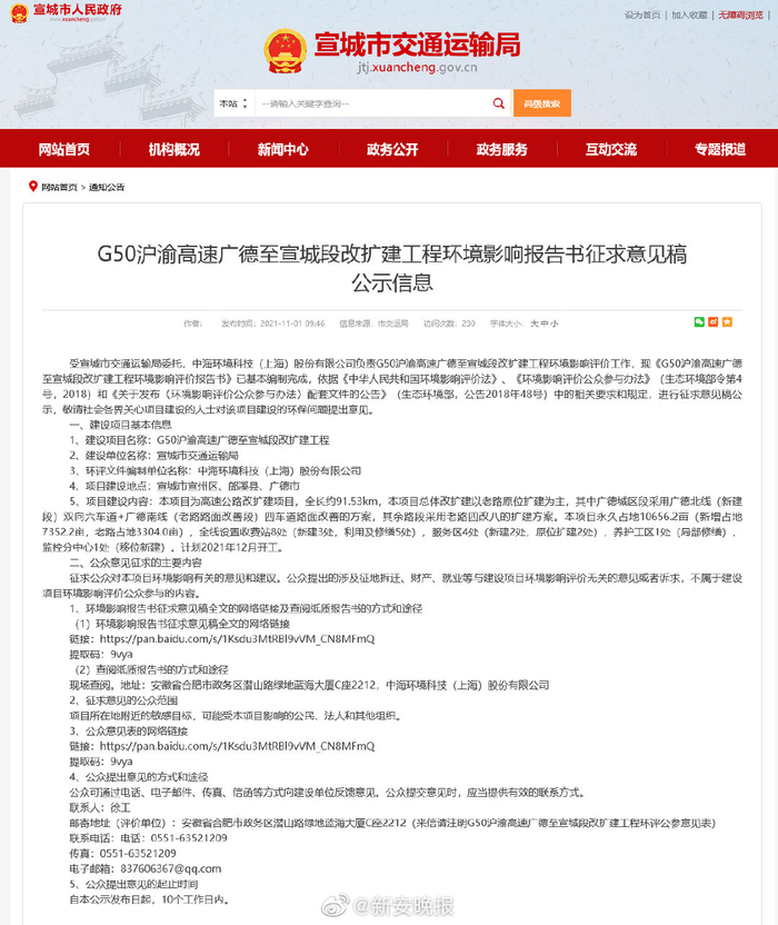 【全线四改八!#沪渝高速宣广段改扩建12月开工#:全长约91.53公里】近日,G50沪渝高速广德至宣城段改扩建工程环境影响报告书征求意见稿公示。该项目为高速公路改扩建项目,全长约91.53km,计划2021年12月开工。多数路段采用老路四改八的扩建方案。全线设置收费站8处,服务区4处。