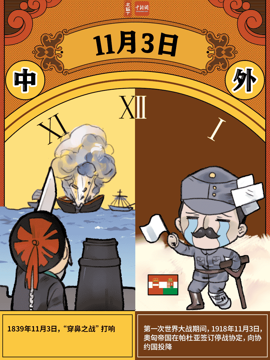 【历史上的11月3日发生过啥?】#那年今日#11月3日有什么特别之处?1839年11月3日,英舰在穿鼻洋(广州虎门口外)挑衅,清水师提督关天培率军击伤英舰一艘,史称“穿鼻之战”;第一次世界大战期间,1918年11月3日,奥匈帝国在帕杜亚签订停战协定,向协约国投降。#一张漫画涨知识#,每天进步一点点!