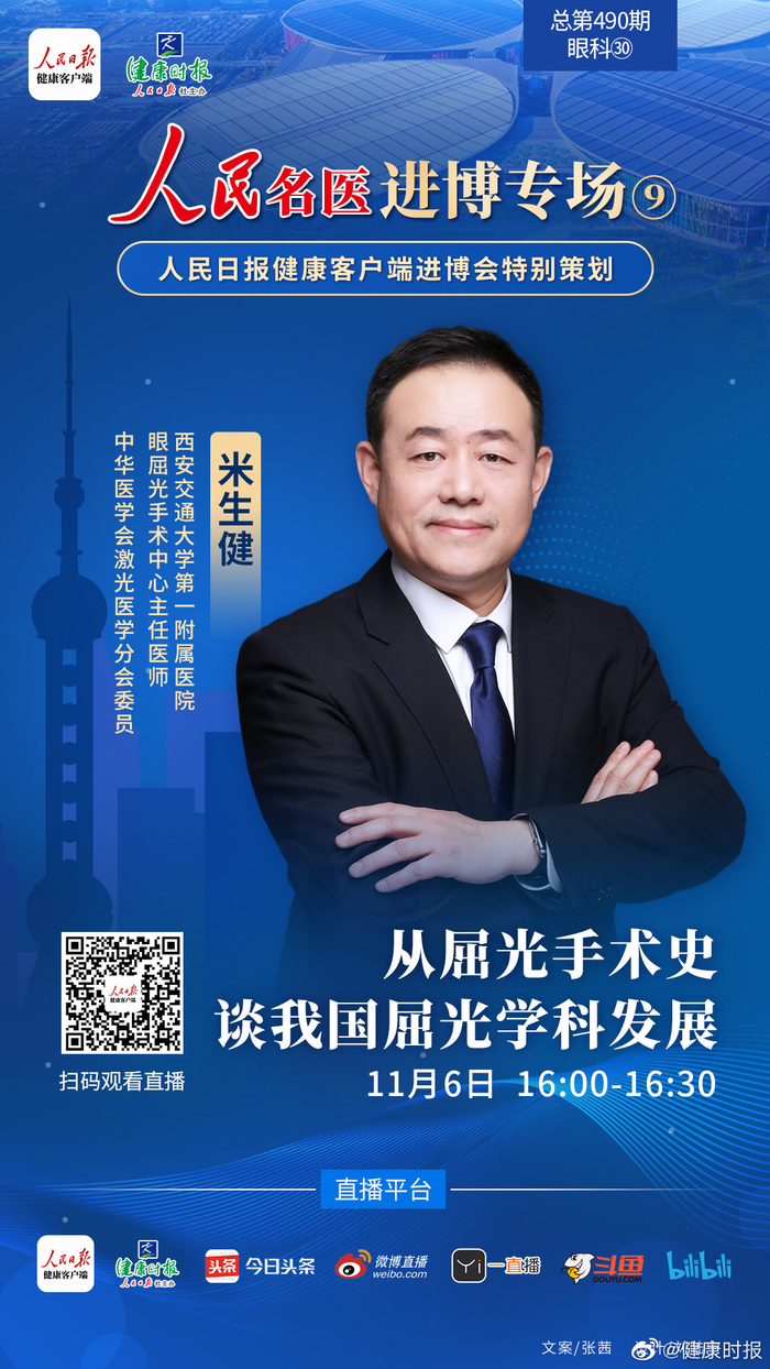#人民名医直播#近视手术什么时候出现?最早是如何被发现的?什么时候被引入我国?在确保近视手术安全方面,经过了哪些努力? 11月6日16:00-16:30,《#人民名医·进博专场#》特别邀请西安交通大学第一附属医院眼屈光手术中心主任医师、中华医学会激光医学分会委员米生健教授为大家回顾屈光手术的发展史,介绍我国屈光学科的发展。米生健教授从事眼科临床工作20余年,完成手术近三万例,具有丰富的临床经验。致力于激光角膜屈光手术的研究,是国内较早开展激光角膜屈光手术的医生之一。欢迎关注!