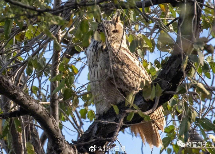 【#体型最大猫头鹰现身北大# #雕鸮连续两年光顾北大#】11月10日,记者从自然科学教育组织科普游子获悉,体型最大的猫头鹰——雕鸮在11月9日现身北京大学。它威风的身姿被正好在附近的观鸟爱好者用相机记录下来。科普游子创始人马庆宇告诉记者,今年以来,雕鸮的身影已在北京多地出现,这也成为了北京城市生物多样性总体良好的又一指征。 据悉,雕鸮是猫头鹰的一种。鸮类指猫头鹰大家族,全世界约200种,中国有30多种。马庆宇介绍,在北京能够看到的鸮类有10多种,如长耳鸮、短耳鸮、纵纹腹小鸮等。而雕鸮是猫头鹰家族中体型最大的一种。 雕鸮广泛分布在欧亚大陆,除了北极圈的冻土带、东南亚雨林带之外,都有雕鸮的身影。它的食性很广,以各种动物为食,并不限于人们熟知的鼠类,野兔、狐狸、雉鸡以及其它鸟类都可以成为它的美餐。之所以有这么强的捕食能力,除了无敌的视力、优异的飞行能力、超强的爪子抓握力,还仰赖它们庞大的体型。雕鸮体长最大可以达到71cm,体重最大可达4.2kg,翼展最大可达1.8米,是当之无愧的“猫王”。 马庆宇告诉记者,这其实是雕鸮连续第二年被发现光顾北大。他分析,这是因为北大有很多高大的树木供它们栖息,这一地区也有不错的食物来源。 但马庆宇同时提醒公众,希望大家尽量不打扰野生动物 , 过多的围观会对它的栖息和捕猎带来严重影响。(@北京日报 记者 赵语涵 图片来源:科普游子)