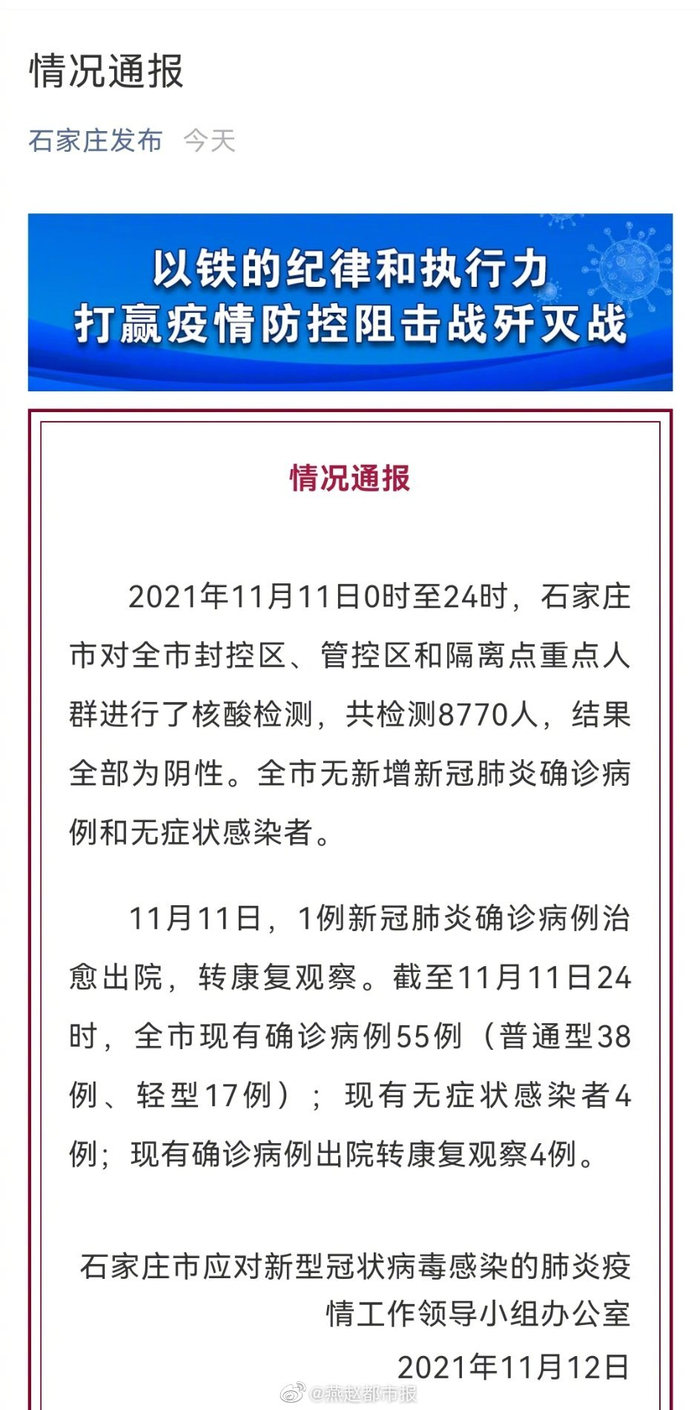 【11月11日#石家庄0新增#[牛哞哞] 】#石家庄疫情# 2021年11月11日0时至24时,石家庄市对全市封控区、管控区和隔离点重点人群进行了核酸检测,共检测8770人,结果全部为阴性。全市无新增新冠肺炎确诊病例和无症状感染者。 11月11日,1例新冠肺炎确诊病例治愈出院,转康复观察。截至11月11日24时,全市现有确诊病例55例(普通型38例、轻型17例);现有无症状感染者4例;现有确诊病例出院转康复观察4例。#河北抗疫日记#