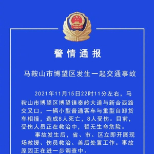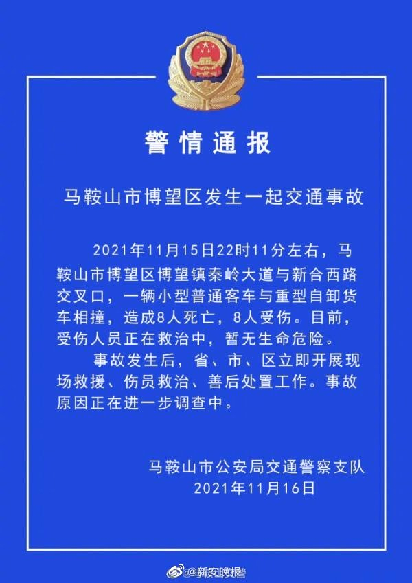 【#安徽马鞍山发生致8死8伤交通事故# 安徽省委书记郑栅洁批示】事故发生后,安徽省委书记郑栅洁立即作出批示,要求全力救治伤员,做好遇难者善后工作,尽快查明事故原因,并委托马鞍山市委主要负责同志看望慰问伤者和遇难者家属,要求省市医疗专家做好伤者治救工作。【#安徽马鞍山发生致8死8伤交通事故#】 11月15日,安徽省马鞍山市博望区发生一起交通事故,造成8人死亡,8人受伤。 2021年11月15日22时11分左右,马鞍山市博望区博望镇秦岭大道与新合西路交叉口,一辆小型普通客车与重型自卸货车相撞,造成8人死亡,8人受伤。目前,受伤人员正在救治中,暂无生命危险