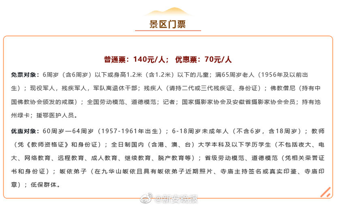 【#九华山景区执行淡季门票价#:普通票降价20元 持续至明年1月15日】从11月15日起,安徽九华山景区开始执行淡季门票价,普通票门票价格从旺季时的160元/张下调至140元/张,优惠票从旺季时每张80元下调至70元。淡季价将持续至2022年1月15日止。冬季,九华山将陆续迎来雾凇和冬雪美景交替上演的绝美景观,你会去看吗?