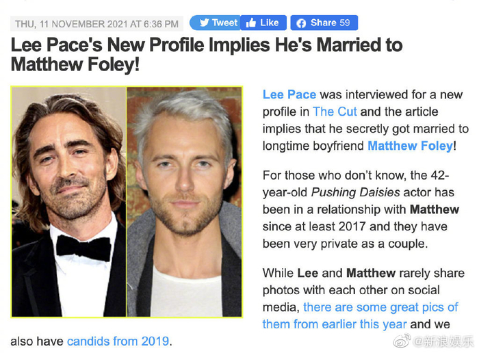 #李佩斯与男友结婚# 据外媒,“精灵王”李·佩斯结婚了!Lee Pace和男友Matthew Foley于2017年开始恋爱,2018年佩佩正式宣布出柜并公开恋情,2019年在纽约两人首次公开同框。恭喜!