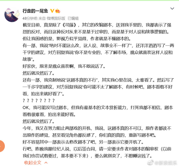 18日,@行走的一尾鱼 发文吐槽剧本改编……
