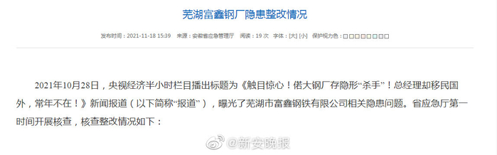 安徽通报芜湖富鑫钢厂隐患整改情况:芜湖富鑫钢厂总经理被解聘