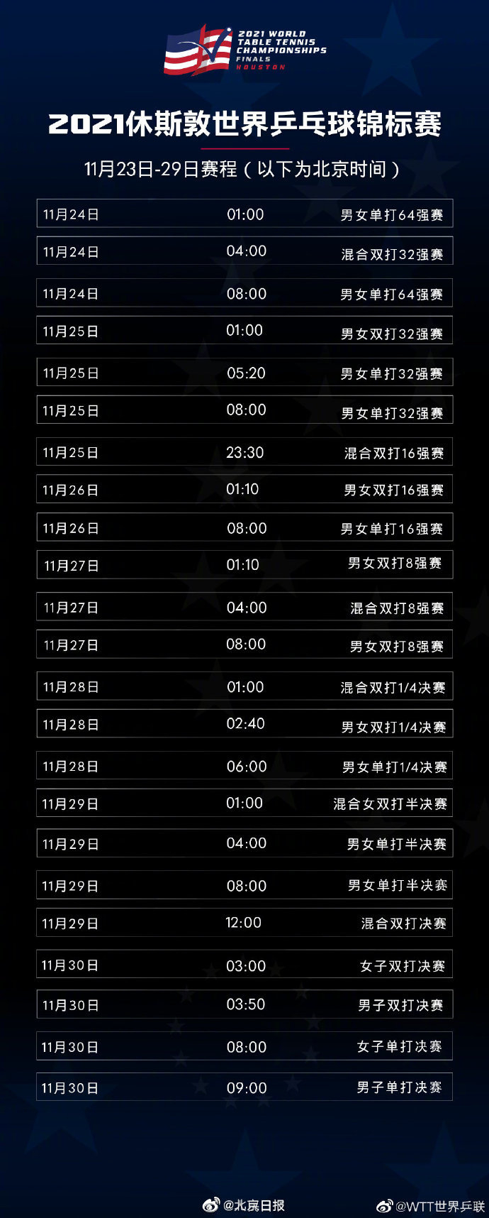 休斯敦世乒赛赛程表出炉 北京日报 《北京日报》官方账号 2021.11.1919:10 关注 【#休斯敦世乒赛赛程表#出炉】2021年#休斯敦世乒赛#将于北京时间11月24日凌晨打响。中国乒乓球队已抵达休斯敦,并投入到赛前训练中。中国队加油!(WTT世界乒联)
