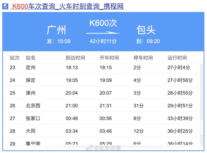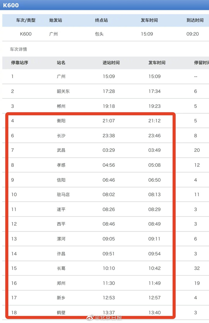 【提醒!#一感染者密接曾乘坐K600列车# 该车经停北京西站】今晚,河南省鹤壁市淇滨区发布消息称,11月20日,淇滨区接到安阳市关于1例境外无症状感染者同车次的密切接触者的协查函。 淇滨区表示,该密接于11月18日21:12分乘坐K600车次13车厢03号下铺,自湖南省衡阳市至河南省鹤壁市,11月19号下午13:37分到达鹤壁火车站,下车后搭顺风车前往滑县,目前该密接及顺风车司机已在滑县集中隔离且核酸结果为阴性。淇滨区提醒,请与该名密接者在上述时间段有相同活动轨迹的群众,特别是同时段乘车、下车人员,立即向当地社区或属地疫情防控指挥部报备,并配合当地疫情防控部门做好核酸检测、隔离观察等相关措施。 @北京日报 注意到,这名密接者乘坐的K600车次,始发站是广州,终点站是包头,全程42小时11分,发车次日21点途经北京西站,停留31分钟。