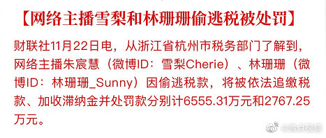 【#网络主播雪梨林珊珊偷逃税被罚超9千万#】11月22日,据财联社消息,从浙江省杭州市税务部门了解到,网络主播朱宸慧(微博ID:雪梨Cherie)、林珊珊(微博ID:林珊珊_Sunny)因偷逃税款,将被依法追缴税款、加收滞纳金并处罚款分别计6555.31万元和2767.25万元。