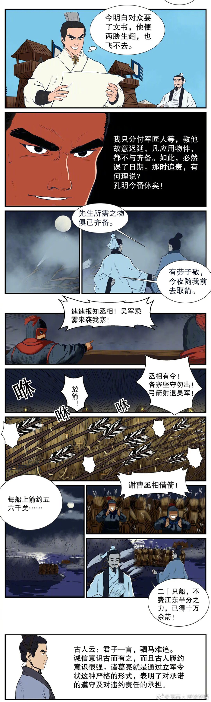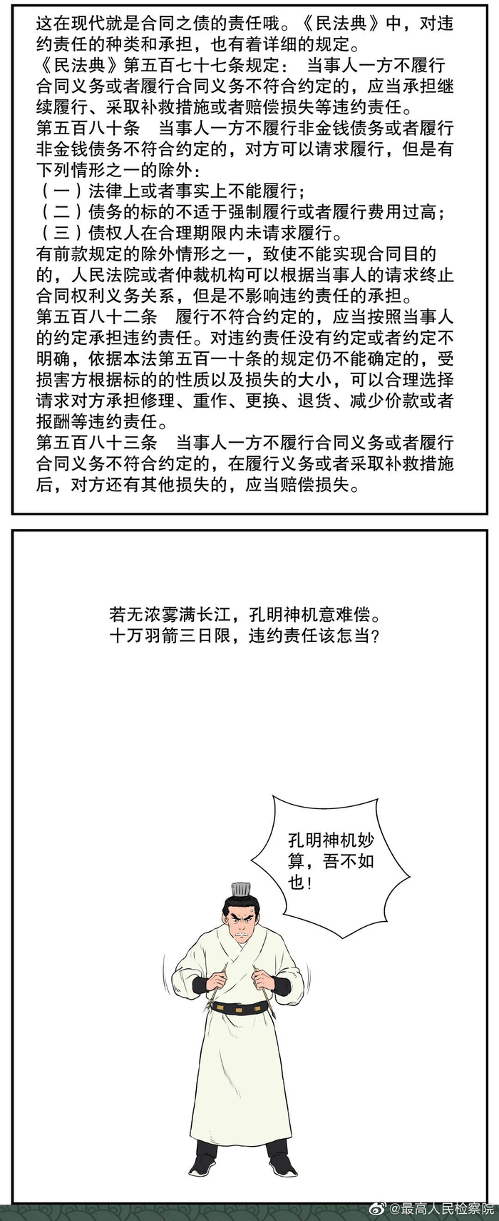 【漫画民法典·三国⑫|孔明先生立军令状,料事如神无惧违约】话说,在三国赤壁大战前夕,周瑜问孔明:“即日将与曹军交战,水路交兵,当以何兵器为先?”孔明曰:“大江之上,以弓箭为先。”随后,孔明立下军令状,三天内取得十万枝箭,最终,孔明用草船借箭,实现了自己的诺言。那么孔明立下军令状的行为在民法典语境下,又对应着何种法律规定呢?一起来看↓↓↓#“典”亮生活#