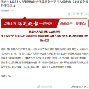 【#保定12333并入保定市12345#】根据《国务院办公厅关于进一步优化地方政务服务便民热线的指导意见》(国办发〔2020〕53号)和《河北省人民政府办公厅关于印发河北省进一步优化政务服务便民热线工作方案的通知》(冀政办字〔2021〕20号)要求,自2021年11月30日零时起,保定市人力资源和社会保障服务电话12333归并至保定市12345政务服务便民热线,实行双号接听。群众可拨打12333或12345,咨询有关人社政策及相关事项。来源|保定晚报