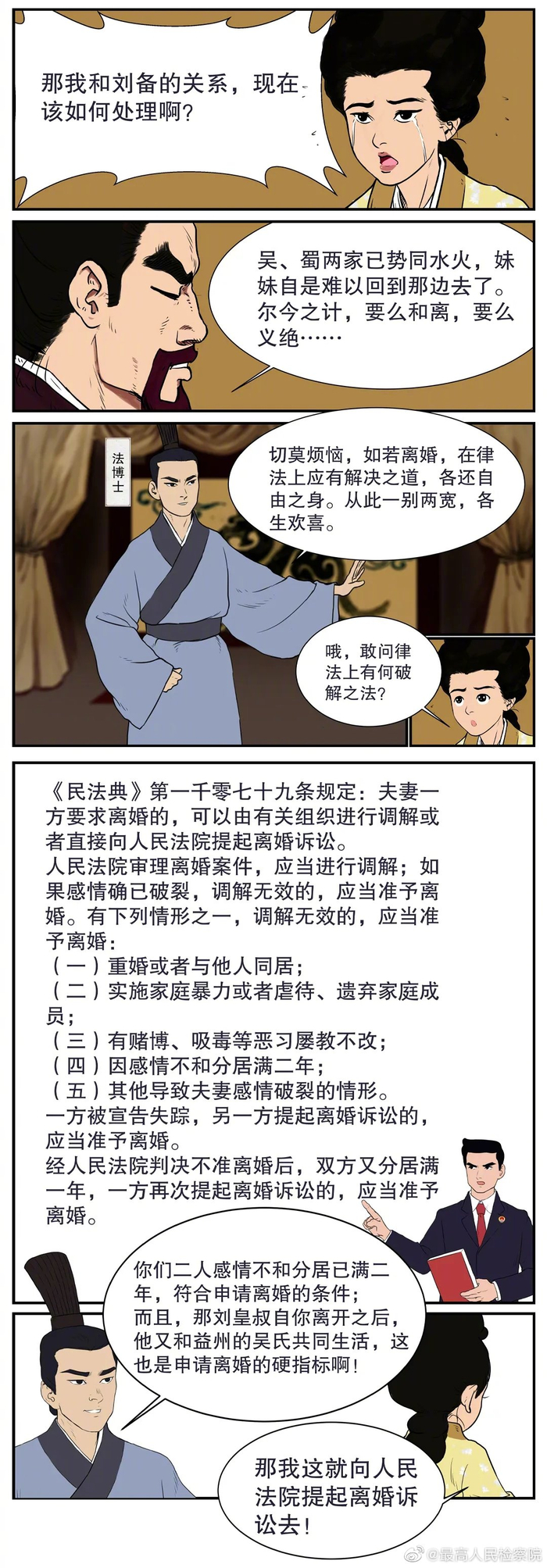 【漫画民法典·三国⑯|刘皇叔婚变失尚香,分居满两年可离婚】话说,为巩固孙刘联盟,孙尚香嫁给刘备。但是三年后,孙尚香回到东吴后一去不返,自此杳无音讯。那么,在民法典中,对于夫妻之间长时间分居的行为又对应着何种法律规定呢?一起来看↓↓↓#“典”亮生活#