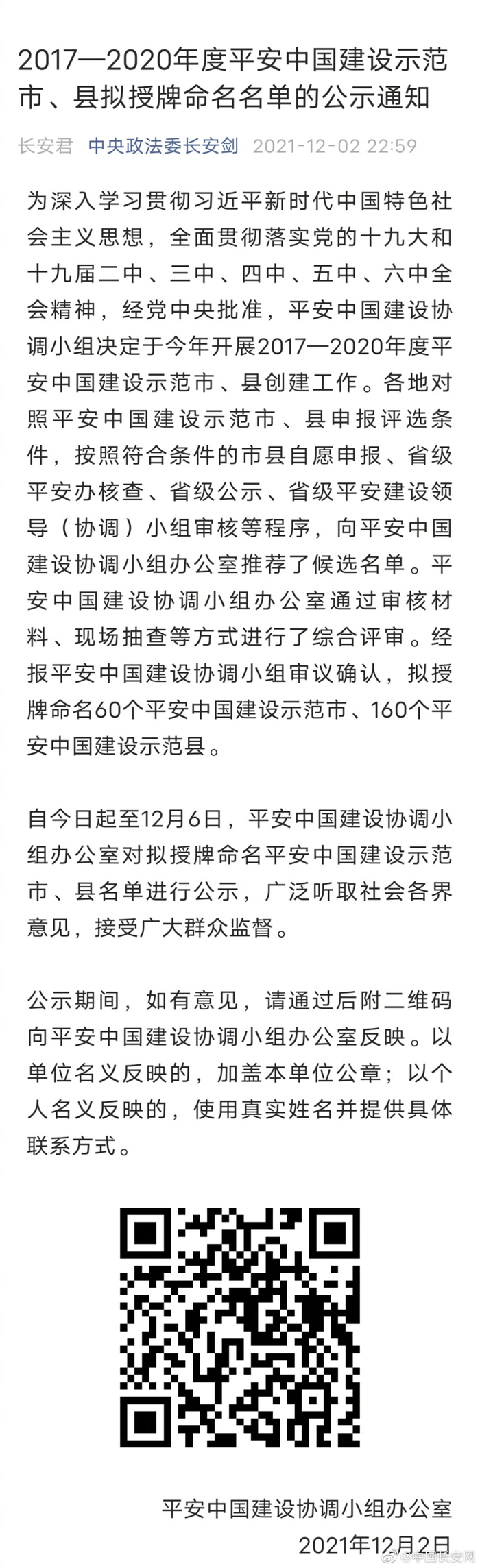 平安中国建设示范市、县名单公示 中国长安网 中央政法委新闻网站官方账号 2021.12.0300:10 关注 【平安中国建设示范市、县名单公示】12月1日至12月6日,平安中国建设协调小组办公室对拟授牌命名平安中国建设示范市、县名单进行公示,广泛听取社会各界意见,接受广大群众监督。戳链接看名单