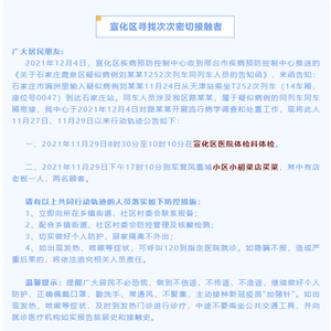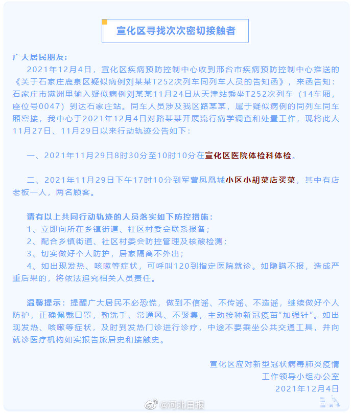 【#张家口宣化区寻找次次密接者#,轨迹涉医院、菜店】张家口市宣化区发布公告,寻找寻找次次密切接触者。公告称,2021年12月4日,宣化区疾病预防控制中心收到邢台市疾病预防控制中心推送的《关于石家庄鹿泉区疑似病例刘某某T252次列车同列车人员的告知函》,来函告知:石家庄市满洲里输入疑似病例刘某某11月24日从天津站乘坐T252次列车(14车厢,座位号0047)到达石家庄站。同车人员涉及我区路某某,属于疑似病例的同列车同车厢密接,我中心于2021年12月4日对路某某开展流行病学调查和处置工作,现将此人11月27日、11月29日以来行动轨迹公告如下: 一、2021年11月29日8时30分至10时10分在宣化区医院体检科体检。 二、2021年11月29日下午17时10分到军营凤凰城小区小胡菜店买菜,其中有店老板一人,两名顾客。 请有以上共同行动轨迹的人员落实如下防控措施: 1、立即向所在乡镇街道、社区村委会联系报备; 2、配合乡镇街道、社区村委会防控管理及核酸检测; 3、切实做好个人防护,居家隔离不外出; 4、如出现发热、咳嗽等症状,可呼叫120到指定医院就诊。如隐瞒不报,造成严重后果的,将依法追究相关人员责任。 温馨提示:提醒广大居民不必恐慌,做到不信谣、不传谣、不造谣,继续做好个人防护,正确佩戴口罩,勤洗手、常通风、不聚集,主动接种新冠疫苗“加强针”。如出现发热、咳嗽等症状,及时到发热门诊进行诊疗,中途不要乘坐公共交通工具,并向就诊医疗机构如实报告旅居史和接触史。#加油河北#(美丽宣化)[编辑|王伟]