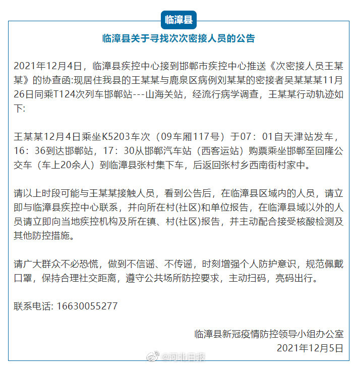 【邯郸#临漳县寻找次次密接人员#】2021年12月4日,临漳县疾控中心接到邯郸市疾控中心推送《次密接人员王某某》的协查函:现居住我县的王某某与鹿泉区病例刘某某的密接者吴某某某11月26日同乘T124次列车邯郸站---山海关站,经流行病学调查,王某某行动轨迹如下: 王某某12月4日乘坐K5203车次(09车厢117号)于07:01自天津站发车,16:36到达邯郸站,17:30从邯郸汽车站(西客运站)购票乘坐邯郸至回隆公交车(车上20余人)到临漳县张村集下车,后返回张村乡西南街村家中。 请以上时段可能与王某某接触人员,看到公告后,在临漳县区域内的人员,请立即与临漳县疾控中心联系,并向所在村(社区)和单位报告,在临漳县域以外的人员请立即向当地疾控机构及所在镇、村(社区)报告,并主动配合接受核酸检测及其他防控措施。 请广大群众不必恐慌,做到不信谣、不传谣,时刻增强个人防护意识,规范佩戴口罩,保持合理社交距离,遵守公共场所防控要求,主动扫码,亮码出行。 联系电话: 16630055277 。来源|云端临漳[编辑|李硕]