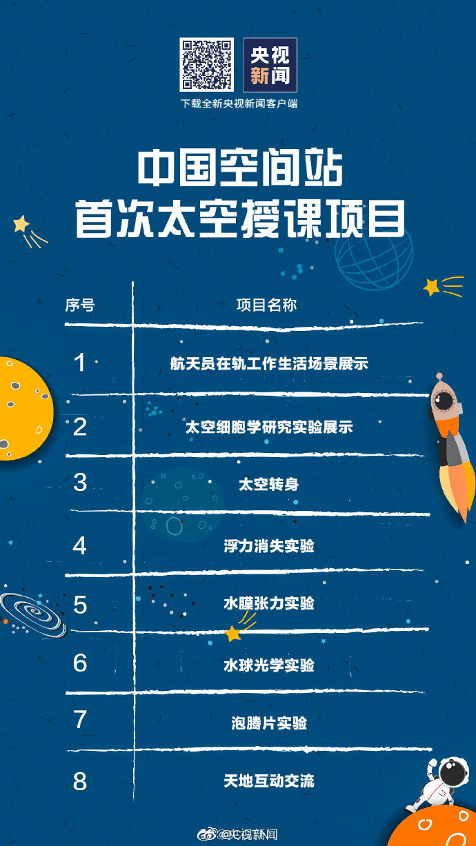 】据中国载人航天工程办公室消息,“天宫课堂”第一课定于12月9日下午开始,神舟十三号乘组航天员翟志刚、王亚平、叶光富将在空间站进行太空授课。中央广播电视总台将进行全程现场直播。Chinese astronauts, or taikonauts, will conduct their first live class from China's space station on Thursday afternoon. The three taikonauts will demonstrate their daily routine and perform physics experiments in space. Check out the course timetable below! For more: