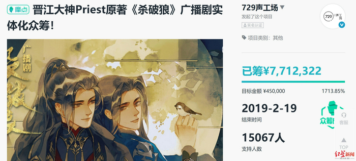 #魔道祖师广播剧收益超千万#【风口之上的广播剧:200元~10000元?#头部声优到底有多赚钱#?】作为一个百亿市场规模的行业,广播剧的崛起确实让部分头部从业者的影响力、收入发生了翻天覆地的变化。据媒体报道,知名配音演员季冠霖曾回忆,过去配一部电视剧,一集可能就200元,一部电影也就一千多元。红星新闻记者从相关渠道获悉,如今国内头部的声优,其录制一集广播剧的费用大概在5000~10000元。更多时候,他们有自己的工作室,各大音频平台会邀请参与制作,给一定的制作费用;第二种模式则是头部配音工作室自己买版权,自己制作发行,与平台分成;第三种模式则是和平台以“保底+分成”的方式合作。 如今,像姜广涛、阿杰、边江、山新这样的顶级声优,早就有了自己的粉丝团,粉丝也会为自己的偶像上节目应援、去录音棚探班、买他们制作的声音产品、看他们的直播。阿杰曾回忆,2018年1月,“729声工厂”举办了一个小型粉丝见面会,560元一张票,开票后400张票几秒钟内被抢光,把他吓了一跳。活动是下午5点开始,粉丝们中午12点就来了,大冬天吹着风,劝都劝不回去。这样的待遇,阿杰在过去想都不敢想。 除了从业者,一些头部IP也是赚得盆满钵满。根据晋江文学城站内公开数据,《魔道祖师》广播剧收益超过千万,《破云》《默读》广播剧收益超过百万。红星新闻记者也注意到,一些头部工作室进行了广播剧的衍生开发。早在2018年,晋江大神PRIEST原著的《杀破狼》广播剧在摩点推出了实体化套装,这部广播剧由“729声工厂”制作,众筹价从298、398元到最高的598元。两个多月的时间捏,该项目在摩点共获得了15067人支持,以771万的累计金额刷新了国内广播剧实体化的最高纪录。