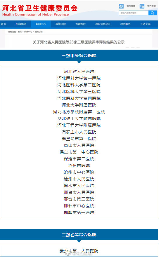 【最新公示!#河北22家医院达到三甲标准#】河北省卫生健康委员会最新公示!根据河北省人民医院等23家三级医院的申请,依据《医院评审暂行办法》《河北省医院评审管理办法》,省卫生健康委组织对23家医院进行了全面评审评价。根据评审结果,确定河北省人民医院等22家医院为三级甲等综合医院,武安市第一人民医院为三级乙等综合医院。来源|河北省卫健委网站[记者|赵小博][编辑|李硕]