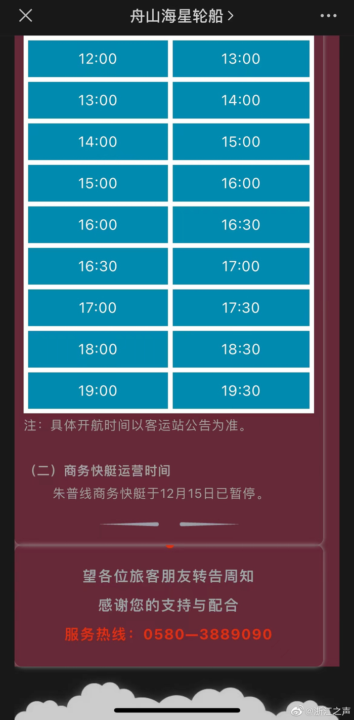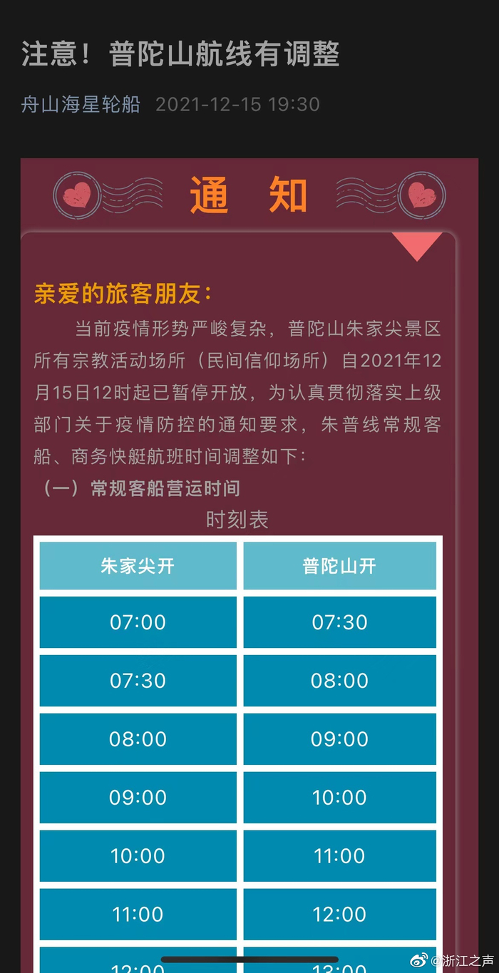 【注意!舟山普陀山航线有调整】记者今天从舟山海星轮船公司了解到,由于当前疫情形势严峻复杂,普陀山朱家尖景区所有宗教活动场所(民间信仰场所)自2021年12月15日12时起已暂停开放,朱普线商务快艇于12月15日已暂停,朱普线常规客船将作出调整。(具体见图)(浙江之声记者周珈伊 舟山台)