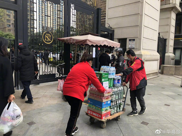 门口已设置了警戒线,不时有快递、外卖人员到达,个别业主站在大门内,安保人员帮忙将快递或外卖隔门递给业主。