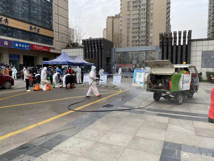 在进行封闭管理的同时,小区也启动全员免费核酸检测。小区大门内,还有几名居民等着亲人送东西。 在小区门外,一辆标着“消杀作业车”的三轮车来回消杀。而朱雀大街上则有大型的防疫消毒喷雾车来回作业。