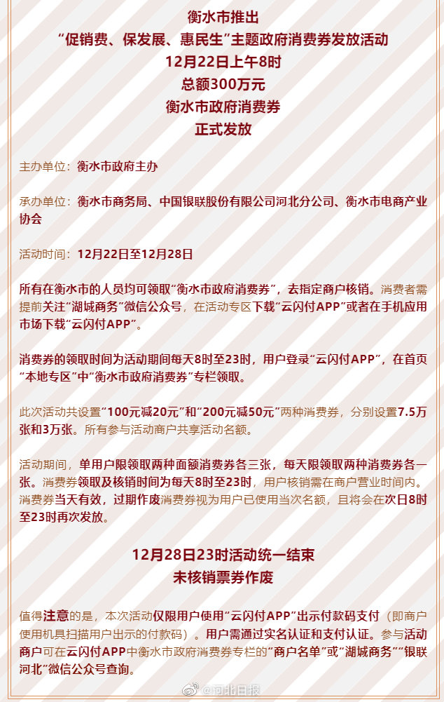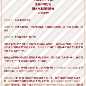 【#衡水市政府300万元消费券22日开抢#】从衡水市商务局获悉,为充分激发消费潜力,鼓励企业做大做强。衡水市推出“促销费、保发展、惠民生”主题政府消费券发放活动。12月22日上午8时,总额300万元衡水市政府消费券正式发放。活动时间:12月22日至12月28日。所有在衡水市的人员均可领取“衡水市政府消费券”,去指定商户核销。消费者需提前关注“湖城商务”微信公众号,在活动专区下载“云闪付APP”或者在手机应用市场下载“云闪付APP”。消费券的领取时间为活动期间每天8时至23时,用户登录“云闪付APP”,在首页“本地专区”中“衡水市政府消费券”专栏领取。此次活动共设置“100元减20元”和“200元减50元”两种消费券,分别设置7.5万张和3万张。所有参与活动商户共享活动名额。来源|衡水头条[编辑|李硕]