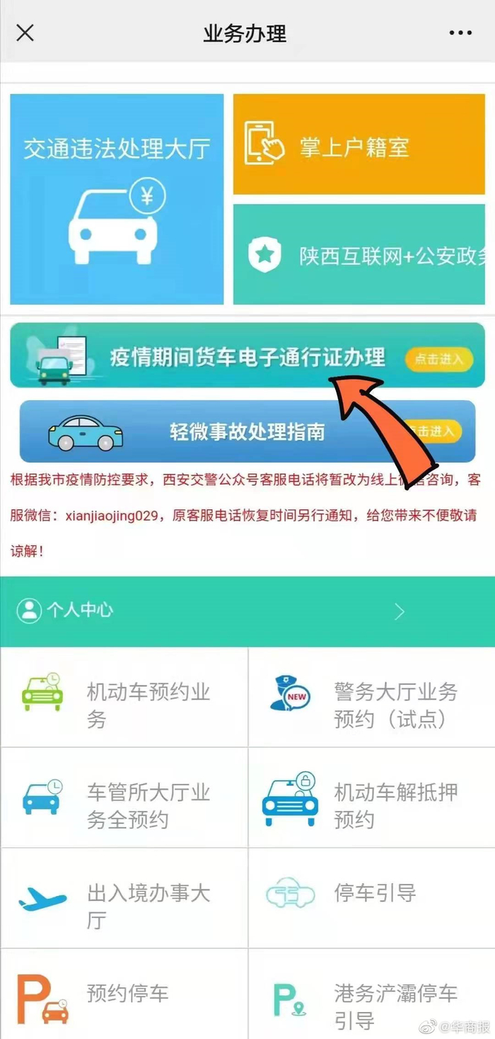 【#战疫长安# 疫情期间货车进出西安 可办电子通行证】华商报记者从西安交警部门了解到,按照西安市疫情指挥部《关于进一步加强疫情防控工作的通告》相关要求,为应对西安严峻复杂的新冠肺炎疫情形势,全力保障疫情防控期间运输生产、生活物资,医疗防护物资,抢险救援等执行特殊任务的车辆安全、高效、有序,西安公安交警在西安交警微信服务号上线开通了“货运车辆临时电子通行证”模块,通过互联网免费提供办理通行证服务。持有此通行证的,必须严格遵守疫情防控相关规定,进出西安市的高速公路各出入口、国省县道路、市区内道路,自觉接受公安交警和防疫等部门查验,拒不服从查验的,此证视为无效。#战疫中的陕西# 为提高物资转运效率,请确需办理的按照办理流程上传驾驶证、行驶证照片,网上填写进出检查站名称及路径,在规定时间内完成卸载并驶出检查站。 对经由市商务局、市发改委等市级相关部门组织的,运输生产、生活物资,医疗防护物资,抢险救灾物资等的载货汽车,原则上不需要办理电子通行证件,只需按照“定点定时,同进同出”的原则,即车辆需从同一个检查点或高速收费站进出,在12个小时内完成卸载并驶离检查站。物资运输车辆进出检查点或高速收费站要自觉接受交警和防疫等部门对核酸、绿码等的查验。 西安交警将在各高速收费站出入口设置防疫物资“绿色通道”,确保物资运输车辆优先快速通行,全力以赴配合市商务局、市发改委等相关部门,保障我市物资运输平稳、顺畅。 华商报记者 张成龙