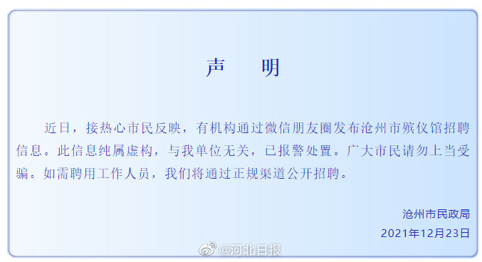【#沧州殡仪馆招聘信息纯属虚构#】据沧州晚报消息: 近日,接热心市民反映,有机构通过微信朋友圈发布沧州市殡仪馆招聘信息。此信息纯属虚构,与我单位无关,已报警处置。广大市民请勿上当受骗。如需聘用工作人员,我们将通过正规渠道公开招聘。[编辑|李硕]