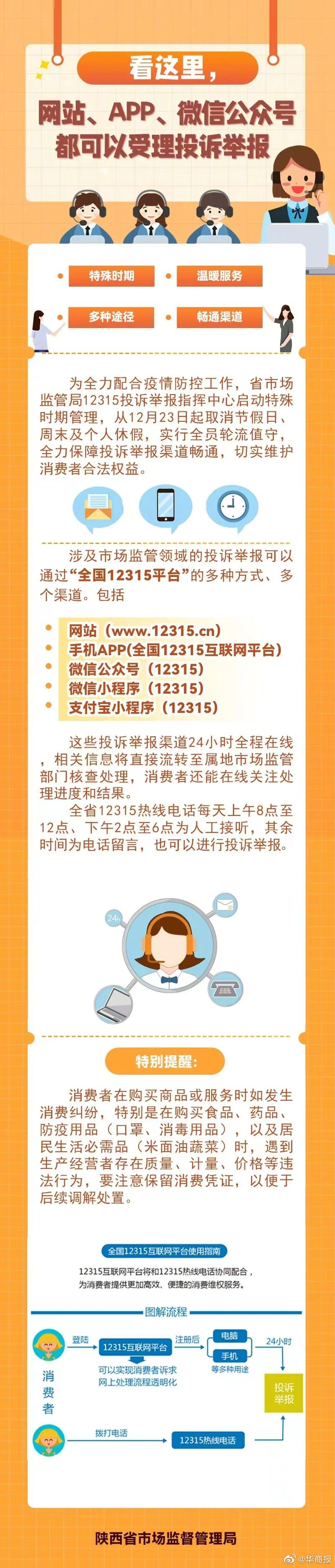 【#疫情期间12315热线持续#,还有其他投诉途径24小时受理】为全力配合疫情防控工作,陕西省市场监管局12315投诉举报指挥中心启动特殊时期管理,从12月23日起取消节假日、周末及个人休假,实行全员轮流值守,全力保障投诉举报渠道畅通,切实维护消费者合法权益。#战疫长安# 涉及市场监管领域的投诉举报可以通过“全国12315平台”的多种方式、多个渠道。包括网站(www.12315.cn),手机APP(全国12315互联网平台),微信公众号(12315),微信小程序(12315),支付宝小程序(12315),这些投诉举报渠道24小时全程在线,相关信息将直接流转至属地市场监管部门核查处理,消费者还能在线关注处理进度和结果。 全省12315热线电话每天上午8点至12点、下午2点至6点为人工接听,其余时间为电话留言,也可以进行投诉举报。 特别提醒:消费者在购买商品或服务时如发生消费纠纷,特别是在购买食品、药品、防疫用品(口罩、消毒用品),以及居民生活必需品(米面油蔬菜)时,遇到生产经营者存在质量、计量、价格等违法行为,要注意保留消费凭证,以便于后续调解处置。(华商报记者 李婧)