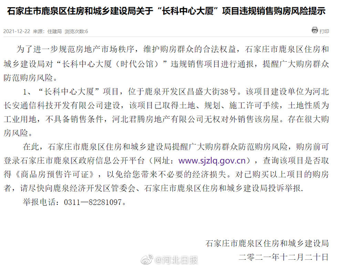 【#石家庄鹿泉区一房地产项目存购房风险#】据石家庄市鹿泉区政府网站消息,为了进一步规范房地产市场秩序,维护购房群众的合法权益,石家庄市鹿泉区住房和城乡建设局对“长科中心大厦(时代公馆)”违规销售项目进行通报,提醒广大购房群众防范购房风险。 通报称,“长科中心大厦”项目,位于鹿泉开发区昌盛大街38号。该项目建设单位为河北长安通信科技开发有限公司建设,该项目已取得土地、规划、施工许可手续,土地性质为工业用地,不具备销售条件,河北君腾房地产有限公司无权对外销售该房屋。存在很大购房风险。对已购买以上项目的购房者,请尽快向鹿泉经济开发区管委会、石家庄市鹿泉区住房和城乡建设局投诉举报。举报电话:0311—82281097。(石家庄市鹿泉区住建局)[编辑|王伟]