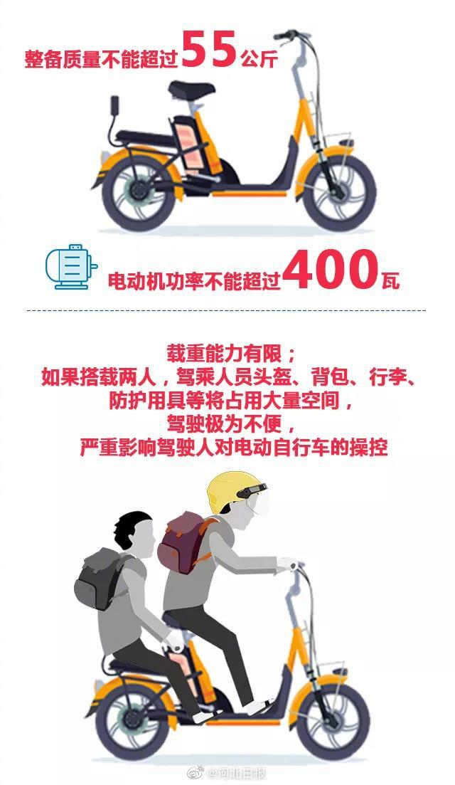【#河北成年人驾驶电动车只能搭载一人#,不限制被搭载人员年龄】《河北省电动自行车管理条例》已由河北省第十三届人民代表大会常务委员会第二十七次会议于2021年11月23日审议通过,将于2022年5月1日实施。 有不少网友问,成年人驾驶电动自行车能搭载成年人吗?搭载限制人数吗?河北省公安厅交通管理局参与《条例》立法的专业人士给出解答↓↓↓ 为什么规定成年人驾驶电动自行车只能搭载一人? 河北省公安厅交通管理局: 从电动自行车的技术参数来看,电动自行车的整备质量不能超过55公斤、电动机功率不能超过400瓦,故载重能力有限;如果搭载两人,驾乘人员头盔、背包、行李、防护用具等将占用大量空间,驾驶极为不便,严重影响驾驶人对电动自行车的操控,一旦遇突发情况,难以采取及时有效的应对措施,极易造成事故。 从群众出行实际情况来看,电动自行车搭载两人时,因为鞍座和后衣架的长度不够,往往有一名儿童需要在脚踏板上站立或乘坐,发生交通事故的瞬间,驾驶人及后排乘坐人员的身体因惯性前移,极易将该儿童挤压到车把立管上,在车辆倒地前,造成儿童严重的磕碰损伤,因此有必要对载人做出限制性规定。 从外省立法情况来看,2018年以来,电动自行车立法的八个省市中,有七个限载一人,并在被搭载人员年龄方面予以限制。综合考虑到河北省群众电动自行车出行安全与需求,《条例》作出了成年人驾驶电动自行车只能搭载一人,且不限制被搭载人员年龄的规定。#河北电动自行车登记上牌方可上路#(河北交警微发布)[编辑|王伟]