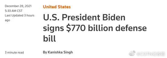 【#拜登签署价值7700亿美元国防授权法案#:针对中俄,71亿美元用于“太平洋威慑计划”】美国总统拜登周一签署了价值约7700亿美元的2022财年国防授权法案,这一数额比上年增加5%。该法案包含了为“太平洋威慑计划”(Pacific Deterrence Initiative)提供71亿美元资金,以及美国国会所谓“支持台湾防御”的声明。