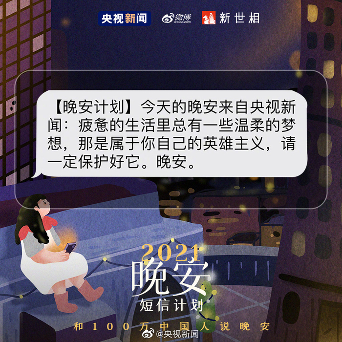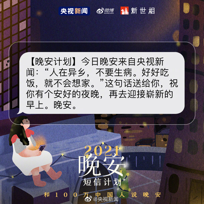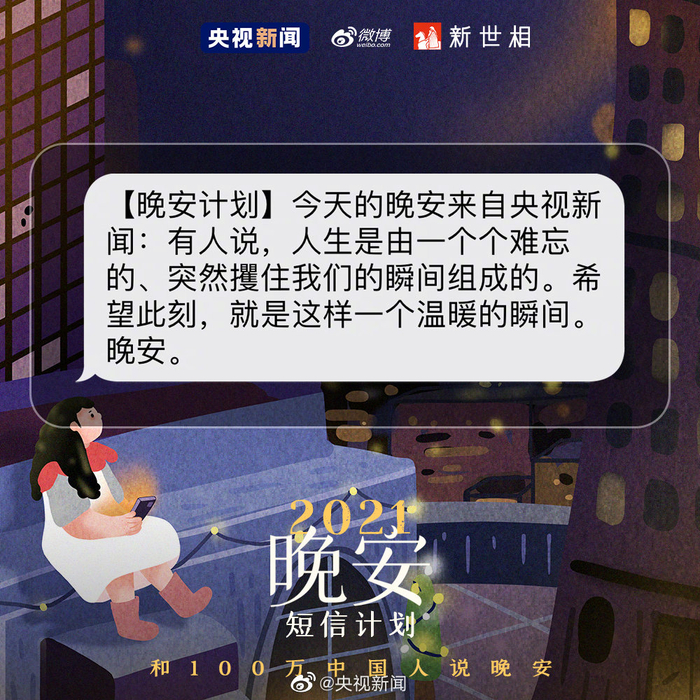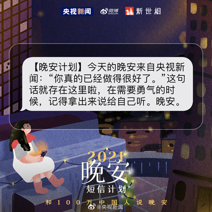 请查收!】今晚,你收到来自@央视新闻 的晚安短信了吗?2021只剩最后几天了,希望今天的短信能给你一些柔软的安慰和温暖的力量。你也可以带话题#晚安短信计划#发微博,把收到的短信分享出来,交换晚安语。祝你有个安好的夜晚,再去迎接崭新的早晨~
