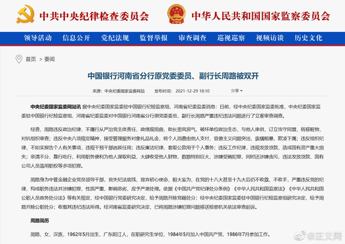 中国银行河南分行原副行长周路被双开
