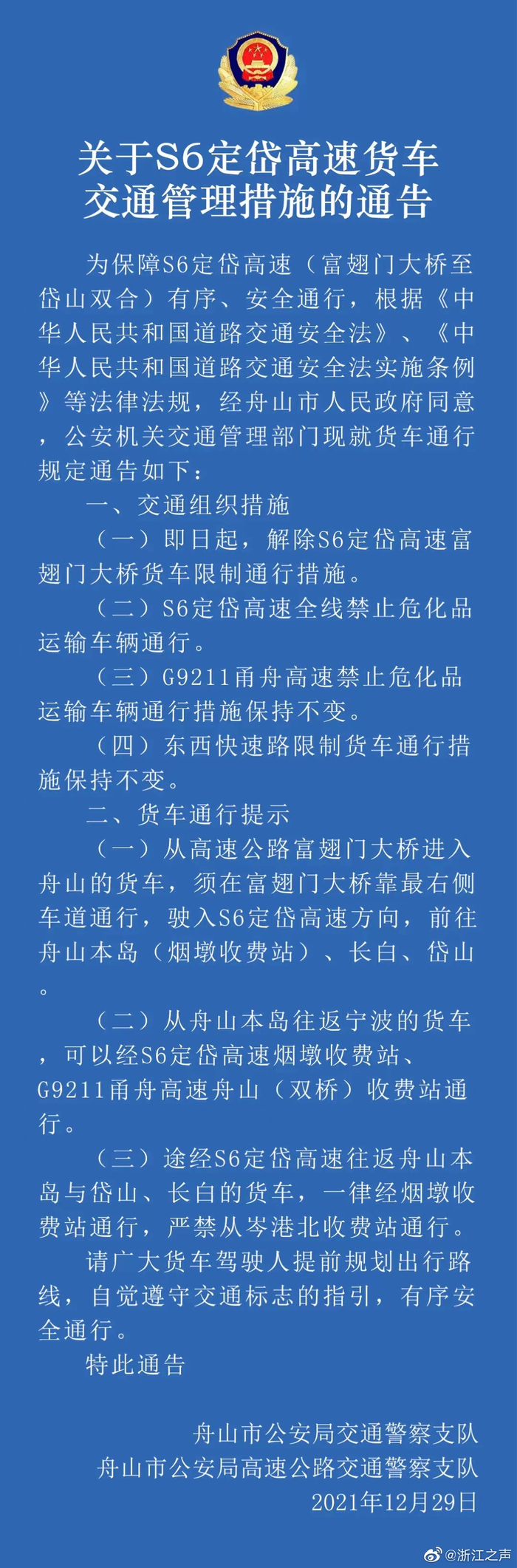 【舟岱大桥今天通车 高速货车通行有调整】 今天中午,舟山高速交警发布了关于S6定岱高速货车交通管理措施的通告: 为保障S6定岱高速(富翅门大桥至岱山双合)有序、安全通行,根据《中华人民共和国道路交通安全法》、《中华人民共和国道路交通安全法实施条例等法律法规,经舟山市人民政府同意公安机关交通管理部门现就货车通行规定通告如下: 一、交通组织措施 (一)即日起,解除S6定岱高速富翅门大桥货车限制通行措施。 (二)S6定岱高速全线禁止危化品运输车辆通行。 (三)G9211甬舟高速禁止危化品运输车辆通行措施保持不变。 (四)东西快速路限制货车通行措施保持不变。 二、货车通行提示 (一)从高速公路富翅门大桥进入舟山的货车,须在富翅门大桥靠最右侧车道通行,驶入S6定岱高速方向,前往舟山本岛(烟墩收费站)、长白、岱山 (二)从舟山本岛往返宁波的货车可以经S6定岱高速烟墩收费站、G9211甬舟高速舟山(双桥)收费站通行。 (三)途经S6定岱高速往返舟山本岛与岱山、长白的货车,一律经烟墩收费站通行,严禁从岑港北收费站通行。 请广大货车驾驶人提前规划出行路线,自觉遵守交通标志的指引,有序安全通行。 (浙江之声记者周珈伊 舟山台)