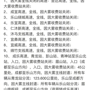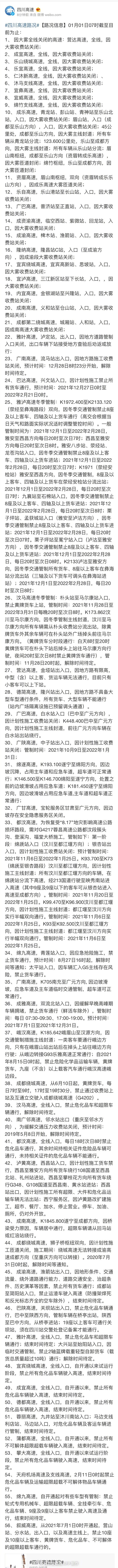 【出行注意!#四川多条高速因大雾关闭收费站#】1月1日,四川省交通运输厅高速公路管理局官方微博发布最新路况,01月01日07时截至目前为止: 1、 因大雾全线关闭的高速:营达高速,全线,因大雾收费站关闭; 2、 成宜高速,全线,因大雾收费站关闭; 3、 乐山绕城高速,全线,因大雾收费站关闭; 4、 乐宜高速,全线,因大雾收费站关闭; 5、 仁沐新高速,全线,因大雾收费站关闭;、 6、 沐马支线高速,全线,因大雾收费站关闭; 7、 宜彝高速,全线,因大雾收费站关闭; 8、 宜威高速,全线,因大雾收费站关闭; 9、 绵竹支线高速,全线,因大雾收费站关闭; 10、 成乐高速,青龙站、彭山站、青神站至乐山北站,入口,因大雾收费站关闭;眉山站,入口(成都至乐山方向),入口,因大雾收费站关闭;45公里处,成都至乐山方向,因大雾主线封道;所有车辆从青龙站分流;123.600公里处,乐山至成都方向,因大雾主线封道;所有车辆从乐山站分流;眉山南枢纽,成都至乐山方向(资眉转成乐高速),因大雾匝道封闭;绵竹枢纽,乐山至成都方向,因大雾匝道封闭; 11、 资眉高速,眉山南枢纽,双向(资眉转成乐乐山方向),因成乐高速大雾匝道关闭; 12、 乐自高速,乐山港站至长山站,入口,因大雾收费站关闭; 13、 广巴高速,普济站至正直站,入口,因大雾收费站关闭; 14、 成资渝高速,临空西站、紫微站、回龙站,入口,因大雾收费站关闭; 15、 成渝高速,椑木站、渔箭站、入口,因大雾收费站关闭; 16、 隆纳高速,隆昌站C站,入口(至成渝方向),因成渝段大雾收费站关闭; 17、 宜宾绕城高速,宜宾高新站、思坡站,入口,因大雾收费站关闭; 18、 宜泸高速,三江新区站至下长站,入口,,因大雾收费站关闭; 19、 内宜高速,金银湖站至兴隆站,入口,因大雾收费站关闭; 20、 成南高速,义和站至仓山站,入口,因大雾收费站关闭; 21、 成都第二绕城高速,城厢站、人和站,入口,因成南高速大雾收费站关闭; 22、 雅叶高速,泸定站,出入口,因地方道路管制入口关闭,出口车辆下站接受地方查验后劝返或放行; 23、 广南高速,流马站出入口,因地方路施工收费站关闭,预计时间:12月28日8时23分开始,解除时间待定。 24、 巴达高速,兴文站入口,因计划性施工禁止所有货车通行,预计时间:2021年12月27日0时至2022年2月21日0时。 25、 雅泸高速冬季管制:K1972.400至K2133.120(荥经至彝海路段)双向,因冬季交通管制禁止8座及以上客车、四轴及以上货车通行(高交会根据当日天气和路面实际状况适时调整管控时间)。一般管制时间为:2021年12月1日至2022年2月28日,雅安至西昌方向每日20时至次日7时;西昌至雅安方向每日20时至次日8时。雅安八步站、荥经站、龙苍沟站入口,因冬季交通管制禁止8座及以上客车、四轴及以上货车进站;2021年12月1日至2022年2月28日,每日20时至次日7时;K1971(荥经安检站)雅安至西昌方向,因冬季交通管制,8座及以上客车、四轴及以上货车在荥经安检站分流出站;2021年12月1日至2022年2月28日,每日20时至次日7时;九襄站至石棉站入口,因冬季交通管制禁止8座及以上客车、四轴及以上货车进站;2021年12月1日至2022年2月28日,每日20时至次日8时;栗子坪站、孟获城站入口(雅安至泸沽方向),因冬季交通管制禁止8座及以上客车、四轴及以上货车进站;2021年12月1日至2022年2月28日,每日20时至次日07时。栗子坪站至冕宁站入口(泸沽至雅安方向),因冬季交通管制禁止8座及以上客车、四轴及以上货车进站;2021年12月1日至2022年2月28日,每日20时至次日08时。K2133泸沽至雅安方向,因冬季交通管制所有货车、8座以上客车在彝海站分流出站(三轴及以下货车可调头在彝海站进站);2021年12月1日至2022年2月28日,每日20时至次日8时; 26、 汶马高速冬季管制:朴头站至马尔康站入口,禁止黄牌货车上站,管制时间:2021年11月28日至2022年3月31日每晚20时至次日8时。K173.862汶川至马尔康方向,因冬季管制主线封道,汶川至马尔康方向所有车辆需从朴头收费站分流出站,除黄牌货车外其余车辆可在朴头站外广场掉头前往马尔康方向。(黄牌货车分时段通行:白天8时至20时黄牌货车可在朴头下站后掉头上站往马尔康方向行驶,夜间20时至次日8时禁止黄牌货车通行),管制时间:11月28日20时起,解除时间待定。 27、 营达高速,金垭站出入口,因地方路有限高,中型(含)以上客、货运车辆无法通行,目前只有小客车可以上下站。 28、 德简高速,隆兴站出入口,因地方路不具备大型车型通行条件,所有货车、大型车辆不能通行(站内广场隔离设施已预留调头通道)。 29、 广巴高速,白水站入口(巴中至广元方向),因计划性施工收费站关闭;K448.400巴中至广元方向,因计划性施工主线封道,前往广元方向车辆在白水站出站绕行。 30、 广陕高速,中子站出入口,因计划性施工收费站关闭;管制时间:2021年10月9日至2022年1月31日; 更多: