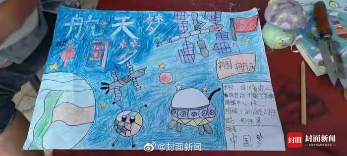 【#凉山小朋友的画参展太空画展# 梦想成为一名航天员】#中国空间站第一次办画展#1月1日,新年第一天,“元旦京港澳天宫对话”活动举行。在交流中,航天员王亚平,介绍起了中国空间站举办的第一次“太空画展”。王亚平说,中国空间站内贴着很多航天主题的画作,这是孩子们送给航天员的新年礼物。其中一幅名为《中国梦》的画,来自冕宁县彝海镇中心校2016级2班的邹伟琴同学。2021年9月,她有幸参加了“青春与星空对话-西部活动”。带着对浩瀚太空的无限遐想和美妙憧憬,孩子们在画纸上勾勒出了自己想象中的火箭、飞船、空间站和神奇的太空生活。