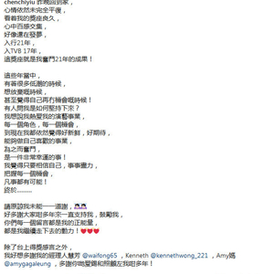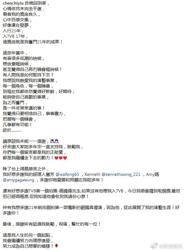 #陈自瑶说获奖是人生另一个起点##王浩信称陈自瑶实至名归# 1月3日,@陳自瑤yoyo 在获得TVB最佳女配角后,发文称这奖座就是她奋斗21年的成果,感谢经纪人、伯乐钱国伟、刘国昌导演和鼓励她的每一个人,“这是我人生的另一个起点,我会继续努力向理想进发!”@王浩信 留言祝贺老婆,“恭喜,实至名归。”