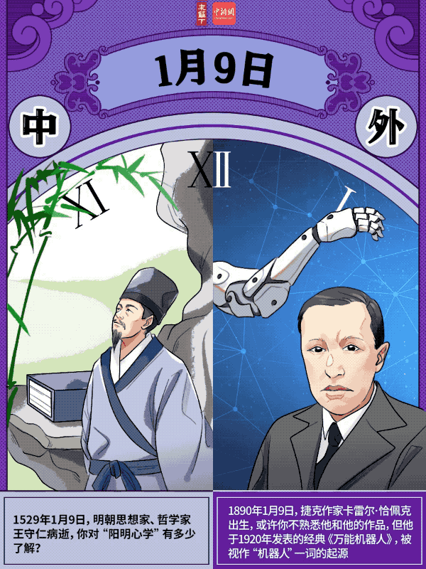 【历史上的1月9日发生过什么大事?】#一张漫画涨知识#历史上的1月9日有什么特别之处?1529年1月9日,明朝思想家、哲学家王守仁病逝,你对“阳明心学”有多少了解?1890年1月9日,捷克作家卡雷尔·恰佩克出生,或许你不熟悉他和他的作品,但他于1920年发表的经典《万能机器人》,被视作“机器人”一词的起源。哪一年的今天对你有特殊意义?发生过什么难忘的事?留言分享一下吧!