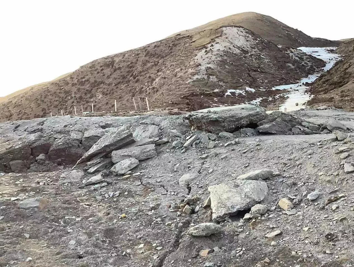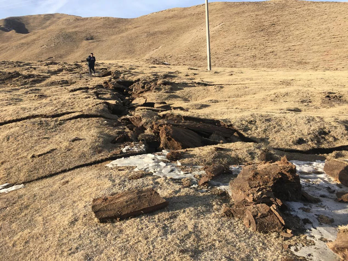 #青海门源6.9级地震# 现场工作队在冷龙岭断裂的西段开展地震现场考察时,发现长约22公里地表破裂带,地表和冰面可见连续张裂隙和挤压鼓包等破裂组合形式,鼓包高达1.5米。初步判定本次地震的发震构造为冷龙岭断裂。#地震微科普# @青海省地震局