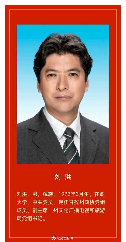 【#甘孜文旅局长刘洪履新# 任甘孜州政协副主席】据康巴传媒消息,1月8日下午,在政协甘孜州第十四届委员会第一次会议上,选举产生了甘孜州新一届政协领导班子。其中,走红网络的甘孜文广旅局局长刘洪,任甘孜州政协党组成员、副主席、州文化广播电视旅游局党组书记。2021年3月,刘洪带队到援建省份广东进行感恩表演活动时,因帮丁真“挡粉丝”,意外因颜值走红。