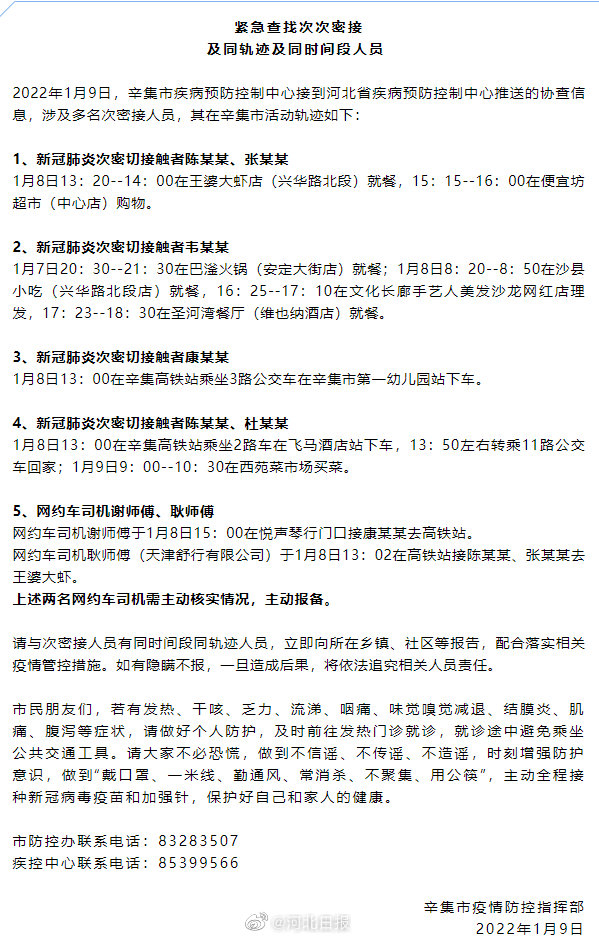 【河北#辛集市公布6名次密接活动轨迹#,#辛集市急寻2名网约车司机#】2022年1月9日,辛集市疾病预防控制中心接到河北省疾病预防控制中心推送的协查信息,涉及多名次密接人员,其在辛集市活动轨迹如下: 1、新冠肺炎次密切接触者陈某某、张某某 1月8日13:20--14:00在王婆大虾店(兴华路北段)就餐,15:15--16:00在便宜坊超市(中心店)购物。 2、新冠肺炎次密切接触者韦某某 1月7日20:30--21:30在巴滏火锅(安定大街店)就餐;1月8日8:20--8:50在沙县小吃(兴华路北段店)就餐,16:25--17:10在文化长廊手艺人美发沙龙网红店理发,17:23--18:30在圣河湾餐厅(维也纳酒店)就餐。 3、新冠肺炎次密切接触者康某某 1月8日13:00在辛集高铁站乘坐3路公交车在辛集市第一幼儿园站下车。 4、新冠肺炎次密切接触者陈某某、杜某某 1月8日13:00在辛集高铁站乘坐2路车在飞马酒店站下车,13:50左右转乘11路公交车回家;1月9日9:00--10:30在西苑菜市场买菜。 5、网约车司机谢师傅、耿师傅 网约车司机谢师傅于1月8日15:00在悦声琴行门口接康某某去高铁站。 网约车司机耿师傅(天津舒行有限公司)于1月8日13:02在高铁站接陈某某、张某某去王婆大虾。 上述两名网约车司机需主动核实情况,主动报备。来源|辛集发布[编辑|李硕]