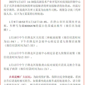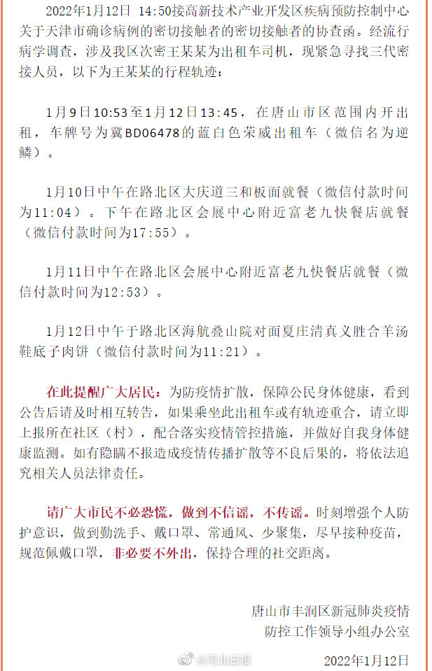 【紧急寻人!#唐山丰润区一次密接为出租车司机#,现公布其行程轨迹】2022年1月12日 14:50接高新技术产业开发区疾病预防控制中心关于天津市确诊病例的密切接触者的密切接触者的协查函。经流行病学调查,涉及我区次密王某某为出租车司机,现紧急寻找三代密接人员,以下为王某某的行程轨迹: 1月9日10:53至1月12日13:45,在唐山市区范围内开出租,车牌号为冀BD06478的蓝白色荣威出租车(微信名为逆鳞)。 1月10日中午在路北区大庆道三和板面就餐(微信付款时间为11:04)。下午在路北区会展中心附近富老九快餐店就餐(微信付款时间为17:55)。 1月11日中午在路北区会展中心附近富老九快餐店就餐(微信付款时间为12:53)。 1月12日中午于路北区海航叠山院对面夏庄清真义胜合羊汤鞋底子肉饼(微信付款时间为11:21)。 在此提醒广大居民:为防疫情扩散,保障公民身体健康,看到公告后请及时相互转告,如果乘坐此出租车或有轨迹重合,请立即上报所在社区(村),配合落实疫情管控措施,并做好自我身体健康监测。如有隐瞒不报造成疫情传播扩散等不良后果的,将依法追究相关人员法律责任。 请广大市民不必恐慌,做到不信谣,不传谣。时刻增强个人防护意识,做到勤洗手、戴口罩、常通风、少聚集,尽早接种疫苗,规范佩戴口罩,非必要不外出,保持合理的社交距离。来源|唐山市丰润区疾病预防控制中心 [编辑|李硕]