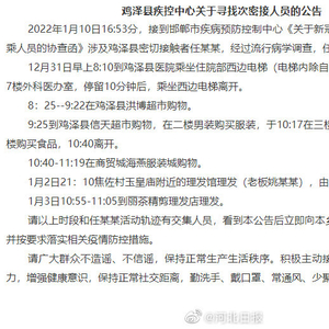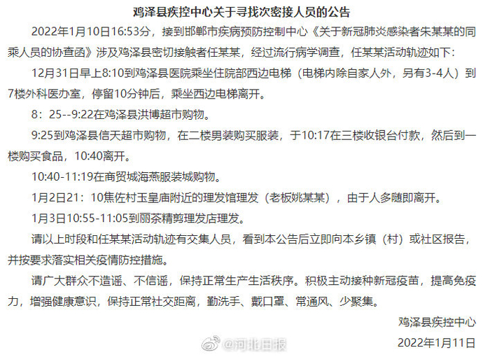 【#邯郸鸡泽县公布1名密接者轨迹#,涉及县医院、超市、服装城等】邯郸市鸡泽县疾控中心发布通告称,2022年1月10日16:53分,接到邯郸市疾病预防控制中心《关于新冠肺炎感染者朱某某的同乘人员的协查函》涉及鸡泽县密切接触者任某某,经过流行病学调查,任某某活动轨迹如下: 12月31日早上8:10到鸡泽县医院乘坐住院部西边电梯(电梯内除自家人外,另有3-4人)到7楼外科医办室,停留10分钟后,乘坐西边电梯离开。 8:25--9:22在鸡泽县洪博超市购物。 9:25到鸡泽县信天超市购物,在二楼男装购买服装,于10:17在三楼收银台付款,然后到一楼购买食品,10:40离开。 10:40-11:19在商贸城海燕服装城购物。 1月2日21:10焦佐村玉皇庙附近的理发馆理发(老板姚某某),由于人多随即离开。 1月3日10:55-11:05到丽茶精剪理发店理发。 请以上时段和任某某活动轨迹有交集人员,看到本公告后立即向本乡镇(村)或社区报告,并按要求落实相关疫情防控措施。 请广大群众不造谣、不信谣,保持正常生产生活秩序。积极主动接种新冠疫苗,提高免疫力,增强健康意识,保持正常社交距离,勤洗手、戴口罩、常通风、少聚集。#加油河北#(精彩鸡泽)[编辑|王伟]